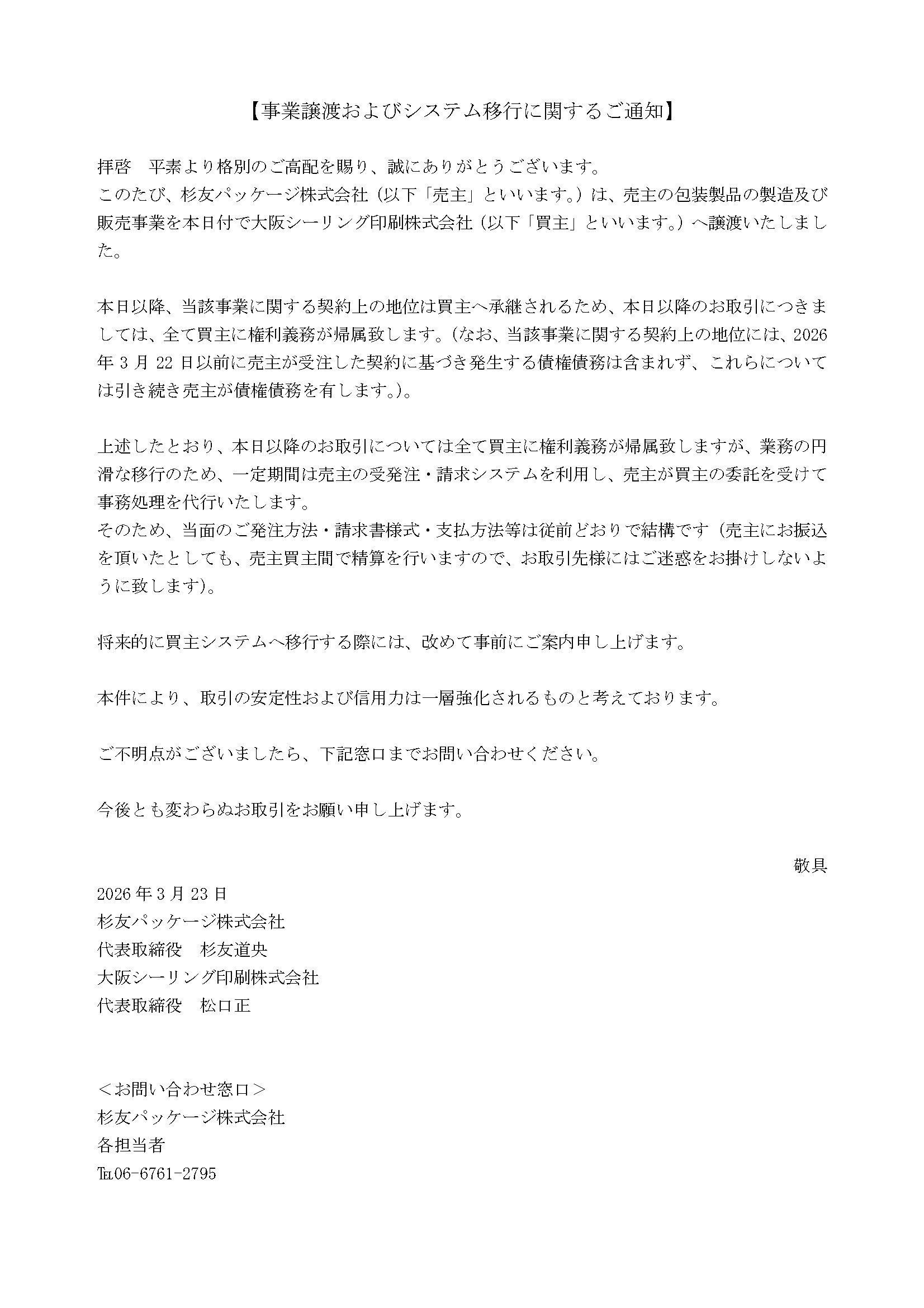 さて、この度弊社・杉友パッケージ株式会社は、2026年3月23日付にて大阪シーリング印刷株式会社へパッケージ製造・印刷・販売の一切の事業を譲渡いたしました。
